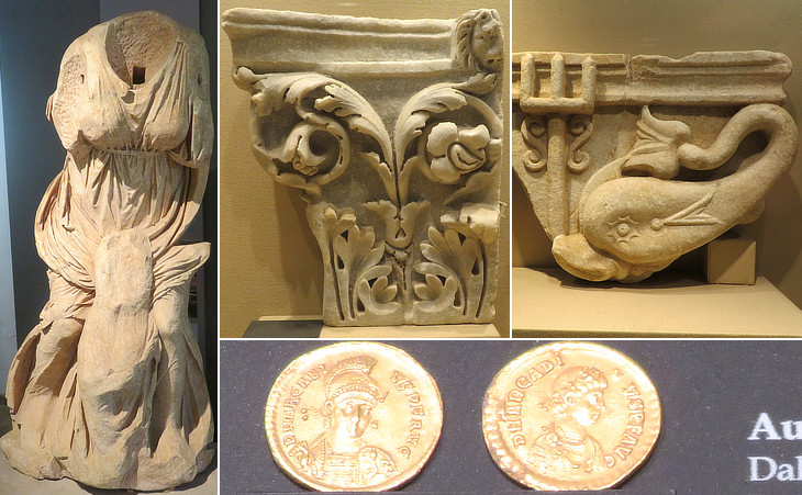 Museum of Villa dei Quintili: (left) statue of Niobe which was found at the Nymphaeum; (right-above) capital and relief; (right-below) "aurei" of Emperor Arcadius