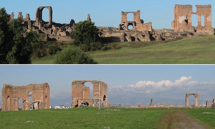 (above) Villa dei Quintili seen from Via Appia Nuova; (below) Villa dei Quintili seen from Via Appia Antica (you may wish to see a 1909 watercolour by Yoshio Markino)