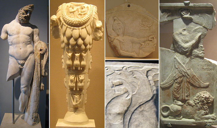 reliefs showing Mithra (above) and a mythological creature (below); Astarte, a Phoenician goddess