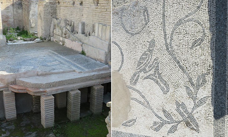 (left) Marble decoration of the frigidarium; (right) "pixelated" decoration of the Nymphaeum