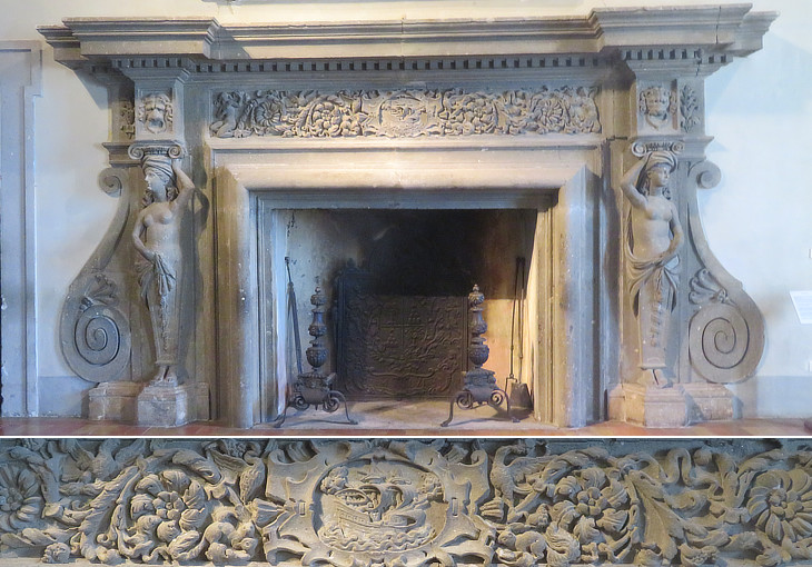 Sala Maestra is part of the original construction of the XVIth century, as proven by the great mantelpiece in peperino stone with caryatids and heraldic symbols of the Savelli along the frieze. The fireplace is equipped with a cast iron screen with the Chigi della Rovere coat of arms which is attributed to Giovanni Paolo Schor, a designer of decorative objects (see one of his works at S. Maria in Campitelli).