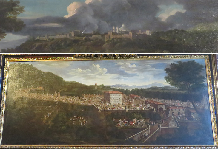 Appartamento del Cardinale - Sala di Apollo aka Sala dei Cani (Dogs): fiefdoms of the Chigi: (above) Ariccia; (below) Villa di Cetinale near Siena