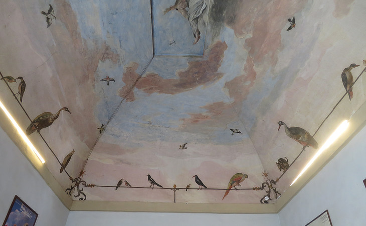 The zodiacal signs on the vaults of each room show only the Spring and Summer months, when the Chigi sojourned at Ariccia. The vault is decorated in tromp