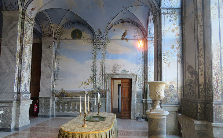 The room is divided into two parts by means of arched pilasters: the loggia and the actual dining room which was used during the summer and autumn stays of the Chigi. The tempera decorations around the balustrade overlooking the park, are allusive of an aviary, with views towards Rome and Genzano. They were painted around 1857 by Annibale Angelini for the marriage between Mario Chigi and Antonietta Sayn Wittgenstein. Opposite the arches of the loggia is the Cratere Chigi, a Roman vase found in 1780 by Sigismondo Chigi in excavations made near the so called villa di Plinio in Porcigliano (Tor Paterno) and restored by Bartolomeo Cavaceppi (see also Tabula Chigi a relief found in the same spot).