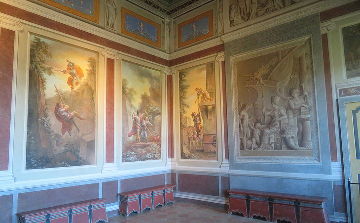 The Ariosto Room is the most significant wall decoration of the palace and it is one of the first examples of neoclassic style, having been painted in the 1780s by Nicola la Piccola (architectural frames) and Giuseppe Cades (Ariosto's stories). Cades was a forerunner of the French historical painting of the early XIXth century which was based on idealized depictions of the Middle Ages and of the Renaissance. You may wish to compare this room with that decorated by Julius Schnorr von Carolsfeld at Villa Massimo in the 1820s.