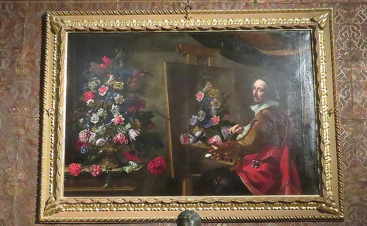 The flowers in the portrait of Mario de' Fiori were painted by Mario de' Fiori himself. He acquired a great fame for the floral arrangements which constitute the subject of almost all his paintings. In the series of the Four Seasons Filippo Lauri (Spring), Carlo Maratti (Summer), Giacinto Brandi (Fall) and Bernardino Mei (Winter) painted the figures and Nuzzi the flowers.