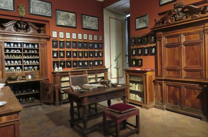 The furniture of the room was moved to its current location in 1918. The pharmacy cabinet was made in 1670 by Antonio
