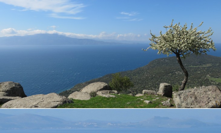 (above) View from the acropolis of Assos towards the island of Lesbos/Mytilini; (below) enlargement showing the castle of Metimno/Molyvos on the northern coast of the island.