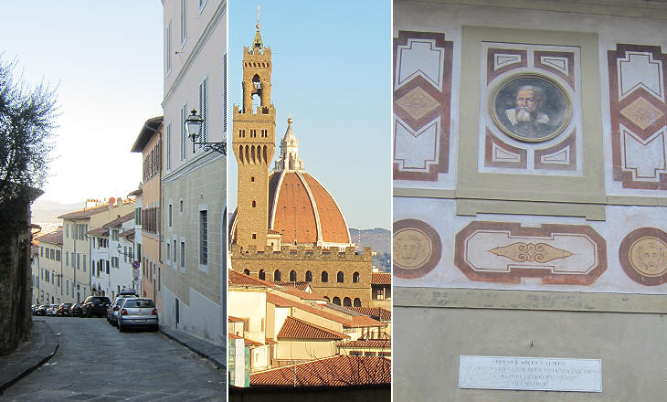 (left) Costa S. Giorgio; (centre) a view towards Palazzo Vecchio from an opening between two houses of Costa S. Giorgio; (right) portrait of Galileo Galilei on the house where he lived his last years