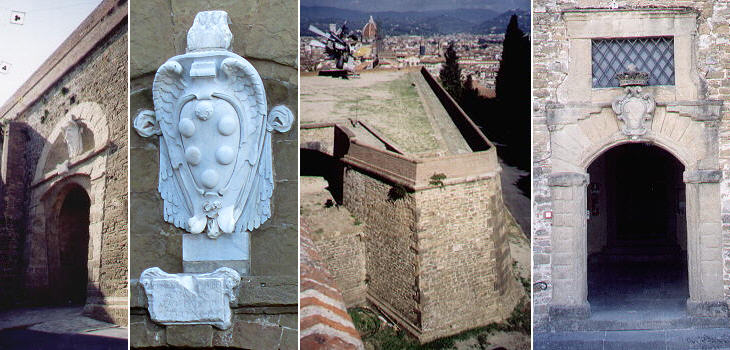 (left) Main entrance and Medici coat of arms; (centre) a ravelin of the fortress; (right) another entrance
