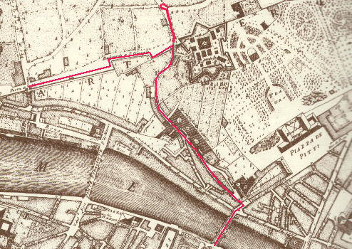 Detail of a 1731 Map: the red line shows the itinerary described in this page including a walk along Via di S. Leonardo