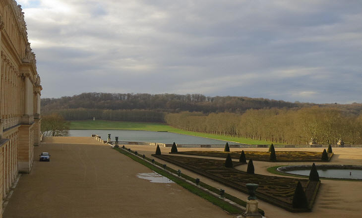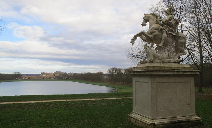 The statue was initially placed near one of the large fountains along the main axis of the gardens, but it was soon "exiled" to open ground which was used by Royal Swiss Guards for their training at the end of Pièce d'Eau des Suisses, a very large pond. Today the area is outside the Palace of Versailles premises.