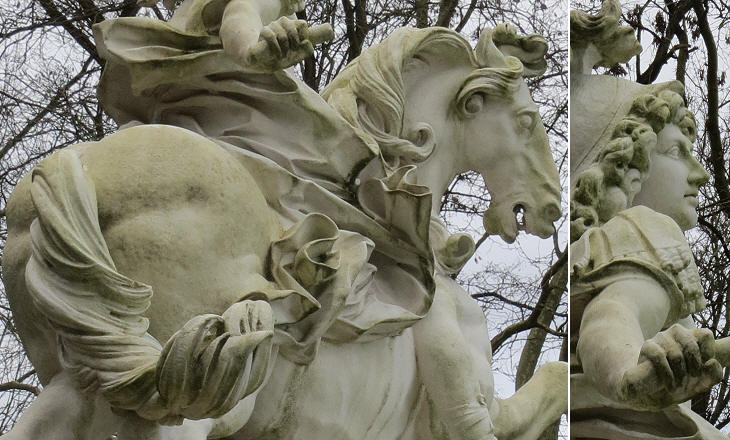 (left) The wind effect of the cloak; (right) how Girardon turned King Louis XIV into Marcus Curtius by reducing the size of the nose; the French still call "nez Bourbonien" a long and prominent nose similar to that of Louis XIV and other members of the Bourbon dynasty