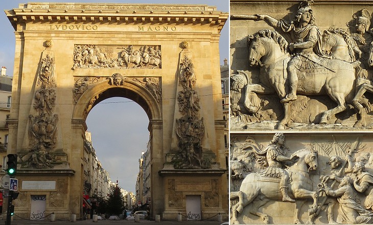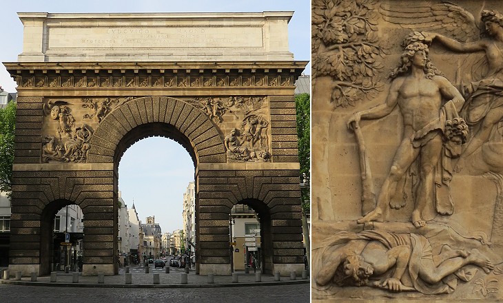 (left) Porte Saint-Denis (designed in 1672 by François Blondel); (right) details of its reliefs portraying King Louis XIV as a Roman emperor leading his troops across the Rhine and receiving the surrender of enemies