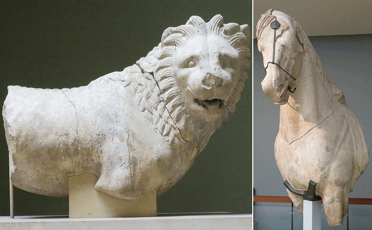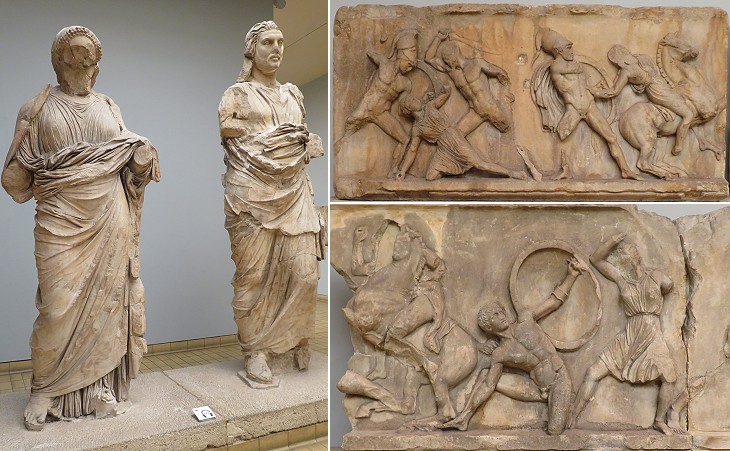 British Museum: (left) statues of Artemisia and Mausolus; (right) reliefs depicting a fight between the Greeks and the Amazons (IVth century BC)