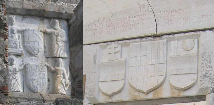 (left) 1473 Relief portraying Virgin Mary and St. Peter holding the (quartered) coats of arms of the Order and Grand Master Orsini; (right) inscription above the (quartered) coat of arms of the Order and Grand Master D'Amboise