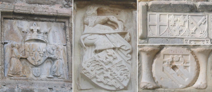 (left) Coat of arms of France; (centre) coat of arms of England; (right-above) coats of arms of the Order, France and the Pope; (right-below) coat of arms making reference to Italy