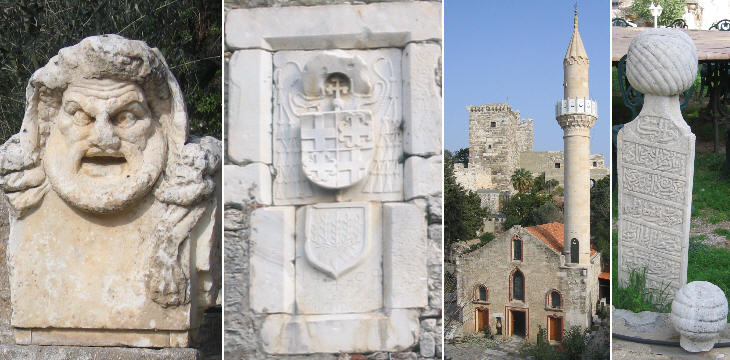 (left to right) Mask of Hercules; coat of arms of Cardinal/Grand Master d'Aubusson; the chapel/mosque of the fortress; Ottoman tomb