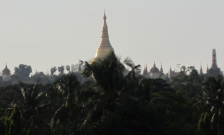 Rangoon (today's Yangon): skyline from Kandawgyi Lake with Shwedagon Pagoda at the centre