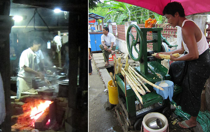 (left) Bagan: kitchen of a small restaurant; (right) Rangoon: a sugar cane juice seller