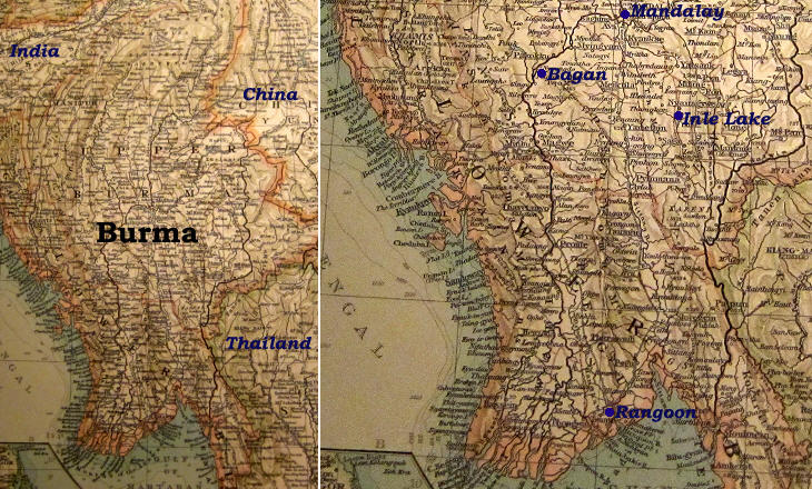 1900 "The Times" Atlas map of Burma: blue dots indicate locations from which postcards were sent