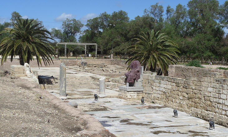 The walls built in 1254 to strengthen the defence of the Crusader town mark the limit of the archaeological park. Its office provides only limited information on the monuments outside the walled town which include a hippodrome. They are situated in an area which has been developed by a private foundation, which acts as a municipality and has therefore great latitude of power.