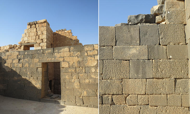 The castle is built with a local limestone, but basalt stones were used for the towers. They came from Hauran, a region north of Qasr al-Hallabat and most likely from Umm al-Jimal, a town entirely built with basalt. 146 stones bear Greek inscriptions: most of them are part of the Edict of Anastasius I, Byzantine Emperor in 491-518, a document dealing with the military administration of the frontier provinces.