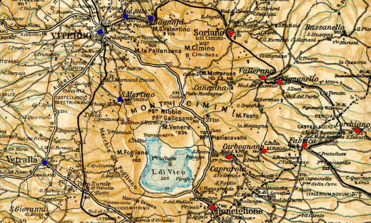 Clickable map of Monte Cimino: (red dots) towns covered in this section; (blue dots) towns covered in other sections