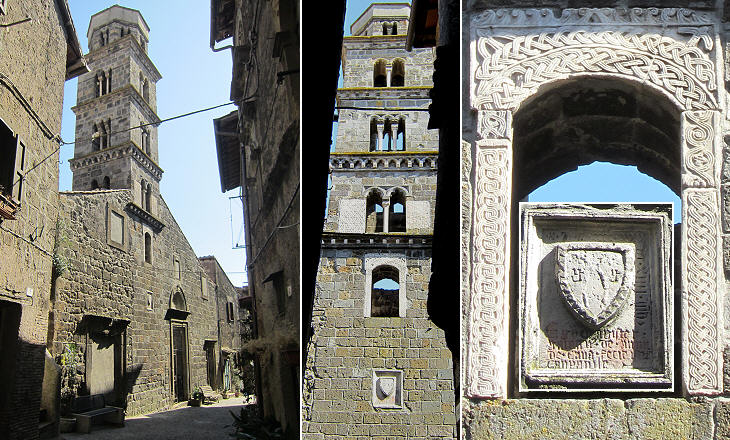 S. Andrea and details of its bell tower; (inset) coat of arms of the Anguillara