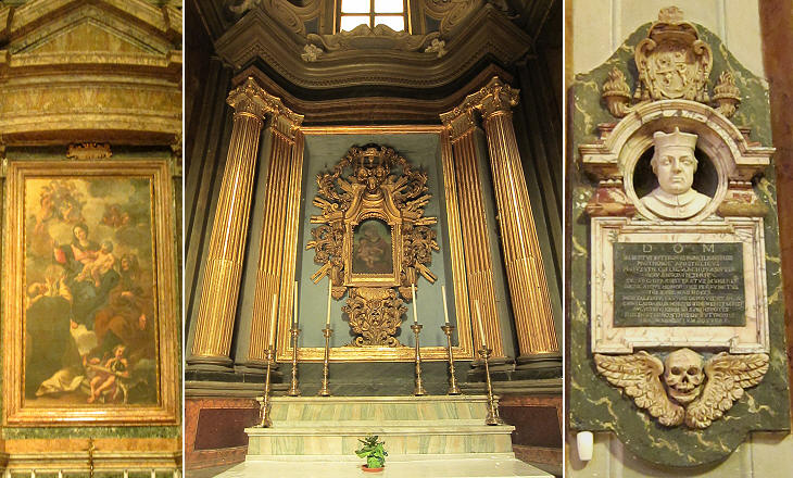 SS. Pietro e Caterina - Interior: (left) Madonna del Rosario by Giuseppe Ghezzi; (centre) chapel in the left nave; (right)