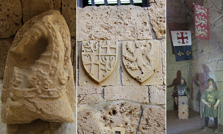 A relief of the Lusignan period; (centre) coats of arms perhaps of the Ibelin-Lusignan: (according to local guides they were placed outside the fortress and they belonged to the Lusignan Kings of Cyprus, four of whom married ladies of the house of Ibelin; for a comparison see the coats of arms at Bellapais); (right) soldiers of King Richard I of England (who conquered Cyprus in 1191) and of Guy de Lusignan
