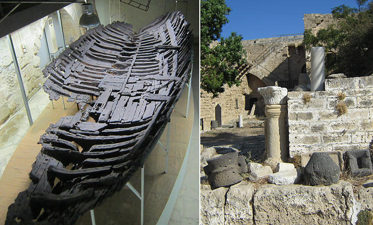 Today the fortress houses a very interesting shipwreck of the IIIrd century BC which carried wine, olive oil and almonds. It was found in 1967 on the northern coast of the island. A series of ancient inscriptions, columns, capitals and millstones are scattered here and there in the vast courtyard, with no references to the locations where they were found.