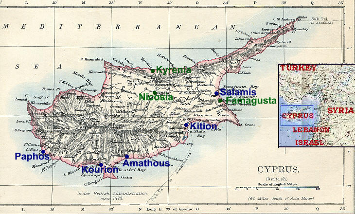 Cyprus (from 1897 World Atlas printed by W. & A. K. Johnston): blue dots: ancient towns covered in this section; green dots: other towns covered in a separate section