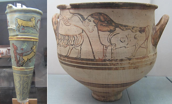 Cretan/Mycaenean influence (XIIth century BC): (left) rhyton (ceremonial cup) found at Kourion; (right) crater found at Enkomi (National Archaeological Museum of Nicosia)