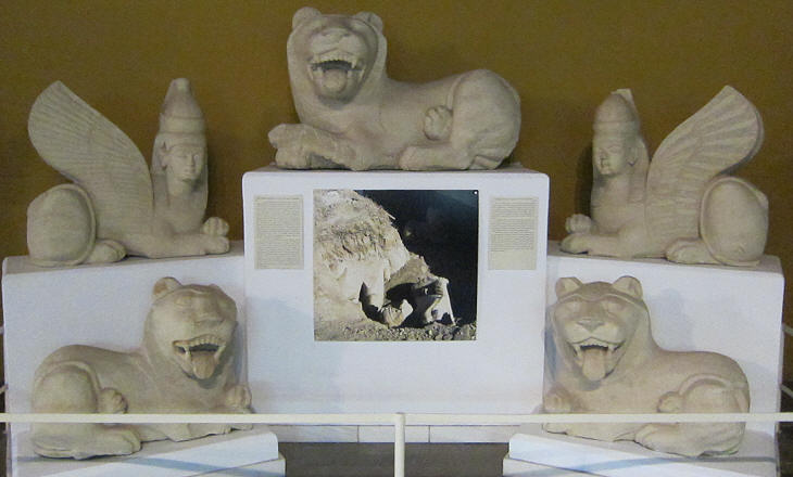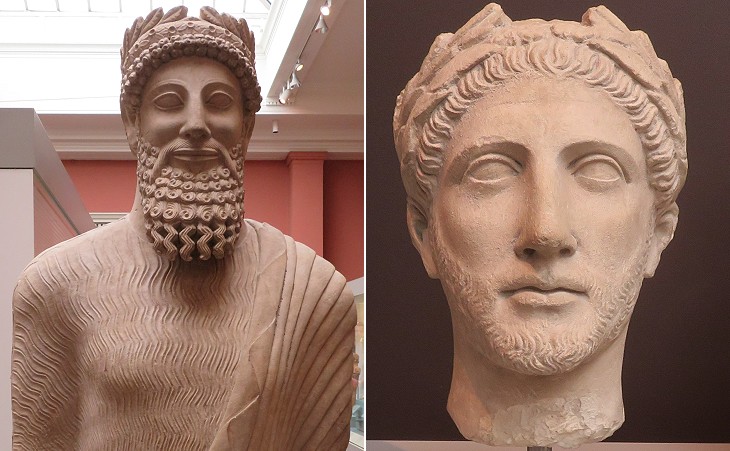 British Museum: statues found in a sanctuary to Apollo at Idalion, an ancient town near Nicosia and showing the passage to Hellenized patterns: (left) ca 450-425 BC; (right) ca 350-250 BC