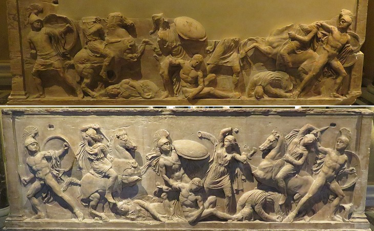 Kunsthistorisches Museum of Vienna: two almost identical long sizes of a sarcophagus depicting a fight between Greeks and Amazons which was found at Soloi