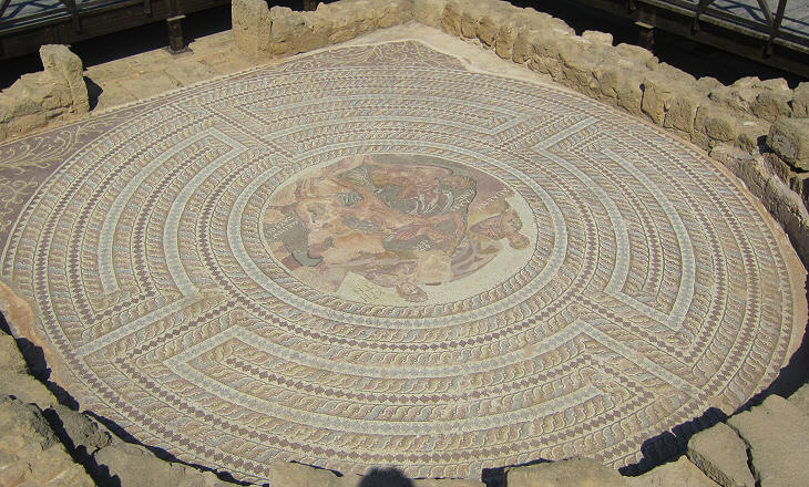 Mosaic at the House of Theseus at Paphos showing the Labyrinth and in the central section Theseus slaying the Minotaur