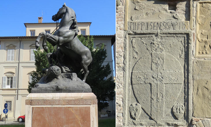 (left) Monument celebrating the end of the Papal State; (right) Torre Civica: 1459 coat of arms of Pope Pius II