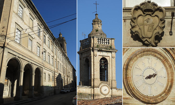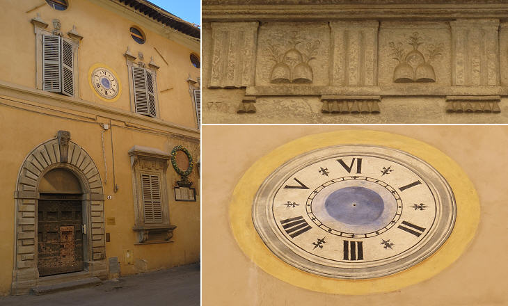 (left) 1785 building housing charities; (centre) bell tower; (right-above) coat of arms of Cittą di Castello; (right-below) another clock set for the Italian hour