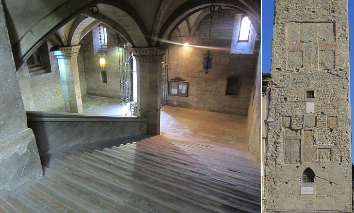 (left) Palazzo Comunale: interior; (right) Torre Civica: detail showing that coats of arms of bishops, popes and town magistrates were placed on it