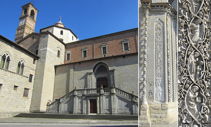 The Cathedral (which adjoins the Town Hall) is a combination of different styles (Gothic, Renaissance and Baroque) and yet the overall result is pleasing to the eye. Even the Gothic portal is a combination of styles, because the relief portraying saints framed by a grapevine was designed keeping in mind some ancient reliefs with acanthus scrolls surrounding animals, e.g. at S. Saba in Rome.