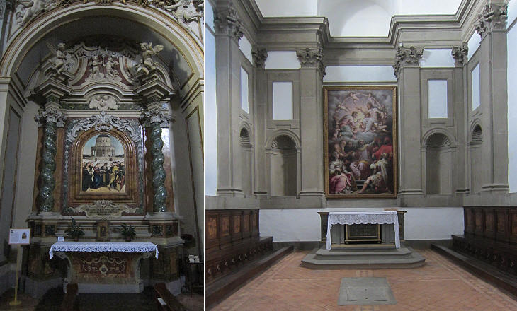 S. Francesco: (left) altar which housed the original of The Marriage of the Virgin by Raphael; (right) Cappella Vitelli