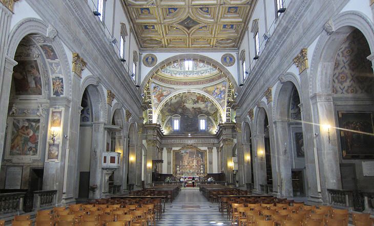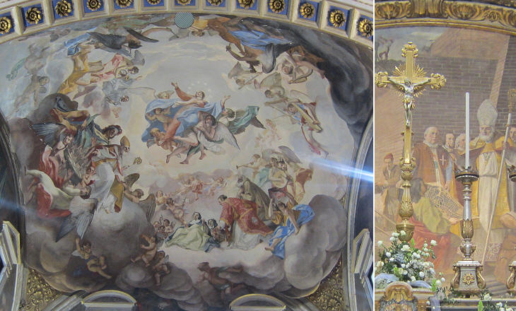 The influence of Rome is evident in some XVIIIth century frescoes. In 1789 an earthquake caused the collapse of the dome and in 1795 Tommaso Conca was commissioned a fresco which follows the pattern of many illusionistic ceilings of Roman churches. Tommaso was a nephew of Sebastiano Conca, a very influential painter in the first half of the XVIIIth century. He was twice Principe dell'Accademia di S. Luca, a sort of chairman of the guild of the artists.