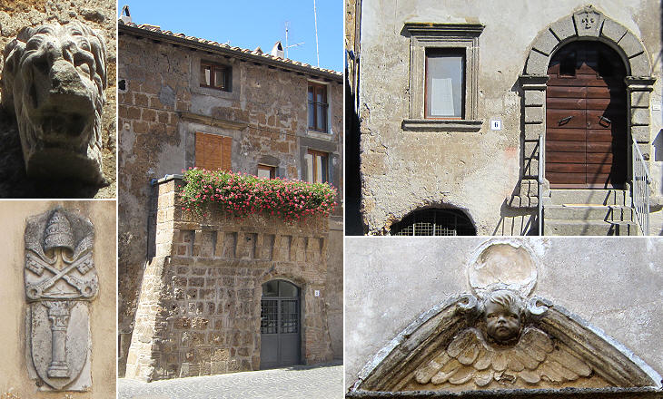 (left-above) Marble lion head on the wall of a house; (left-below) coat of arms of Pope Martin V;