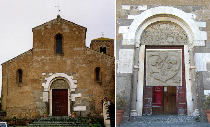 S. Francesco: (left) façade: (right) portal; (inset) detail of the relief showing the head of a devil