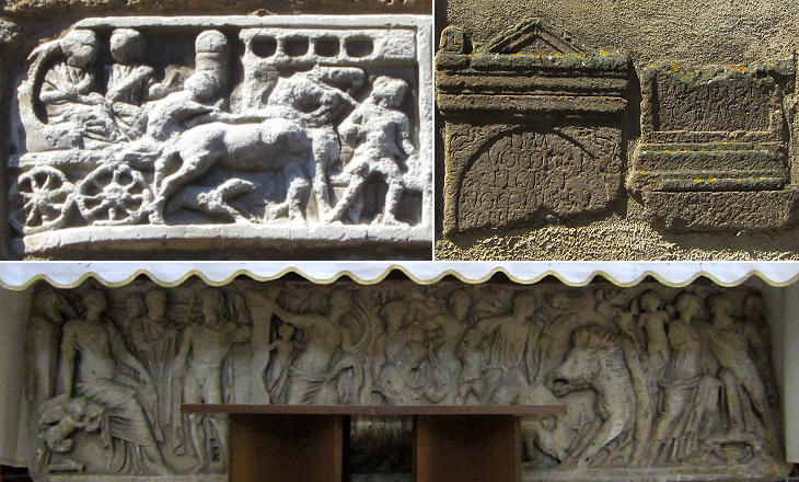 (above-left) Relief of a Roman sarcophagus portraying a wealthy couple on their last journey; (above-right) ancient gravestones;