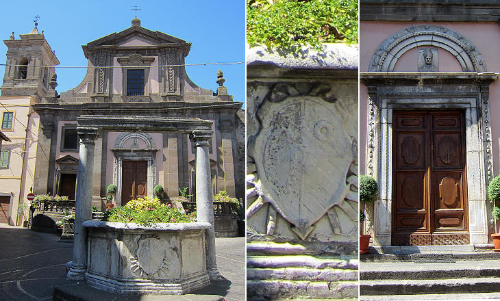 (left) S. Maria Assunta and a Renaissance well; (centre) coat of arms of Renzo di Ceri uniting those of the Anguillara (left) and of the Orsini (right); (right) portal, a detail of which can be seen in the image used as background for this page