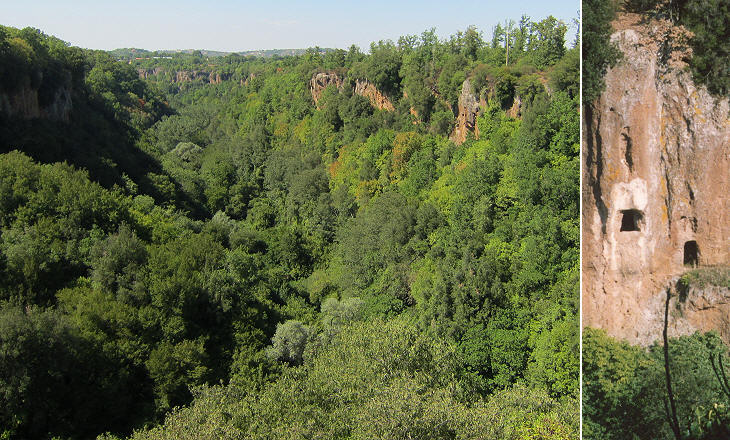 The walk from Blera to the river is a very interesting one; one can see the tombs cut by the Etruscans into the rock which were turned into stables (and houses) during the Middle Ages and today are used as cellars. At some locations Via Clodia was cut into the rock. Several Etruscan tombs have been found in the gorge, either at the top of the cliff or by the river.