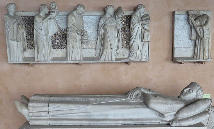 Riccardo degli Annibaldi was one of the most influential cardinals of the XIIIth century. He participated in the election of nine popes. His funerary monument is a work by Arnolfo di Cambio, but only the statue of the dead and a panel of priests celebrating mass are housed in the cloister. They most likely were part of a monument similar to those Arnolfo designed for Pope Adrian V and Cardinal Guillaume de Braye. You may wish to see the monument to Stefano de' Surdis, a nephew of the Cardinal, at S. Balbina.