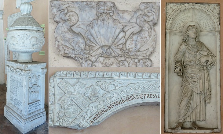 (left) XIIIth century column; (centre) XIIth century bronze doors; (right) stone with a mosaic cross and a Jewish inscription